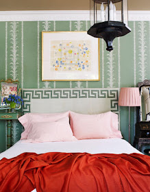One of my recent magazine feature favorites, the bedroom below belongs to Los Angeles designer Joe Nye. His design apparently began with the chinoiserie curtains which led to the fabulous wallpaper and I'm sure everything else just fell in line behind that. In designing the very small bedroom of his only 900 square foot apartment, he also determined the large buffet a key piece, claiming that "such a giant piece of furniture in a small room...can make a room feel bigger". Having employed that strategy myself in my own small spaces, I'd have to agree. In this room, I think it also helps that the large buffet is finished in a soft color that blends nicely with the green of the wallpaper, making it less intrusive than it might be otherwise. There are so many other really pretty elements in this room, I'll just let you look at the photos below and see for yourself that comfort and luxury are possible in even the smallest of spaces.